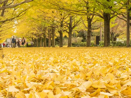 秋天除了紅楓與橙葉,金黃色的銀杏 也是東京最迷人的秋日色彩。位於市中心的 明治神宮外苑,建於 1926 年,以聖德記念繪畫館為核心,園區內設有神宮球場等設施,同時保留了四季皆宜的自然景觀,是東京著名的休閒去處。