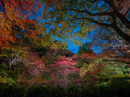 紅葉季時,園內色彩層次豐富,金黃與鮮紅交織,映照在水面上宛如畫卷。夜間點燈更讓遊客得以一窺六義園另一面的幽靜與華麗,絕對是東京秋季最值得體驗的紅葉盛景之一。