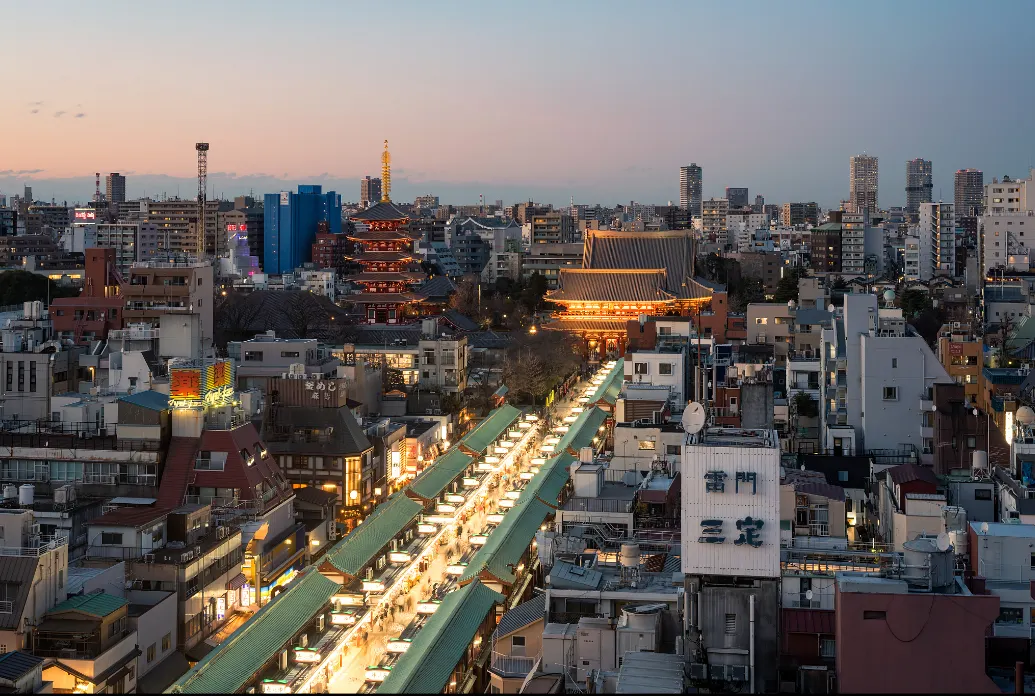 淺草寺始建於628年,是東京最古老的佛教寺廟之一,擁有豐富的歷史,每天來參拜祈福的遊客絡繹不絕。寺內標誌性的「雷門」,以及被列為重要文化財產的「淺草寺傳法院」等建築,展現了日本歷史與文化的深厚底蘊。寺前有一條繁華的商業街,在這條熙熙攘攘的商業街上,遊客可以選購各式和菓子、日本茶,以及其他能體現日本傳統文化的特產。