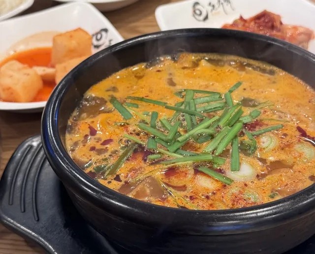 豬肉湯湯飯是釜山傳統料理,以濃郁的豬骨湯底,加入豬肉片和白飯,配上泡菜一起食用,味道豐富且充滿營養。