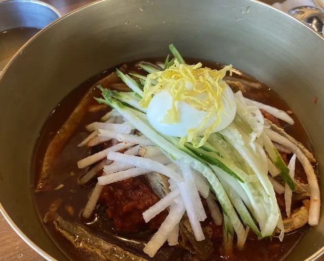 釜山冷麵以小麥麵為主料,配上清爽的湯底和各種配料,特別適合夏天食用。