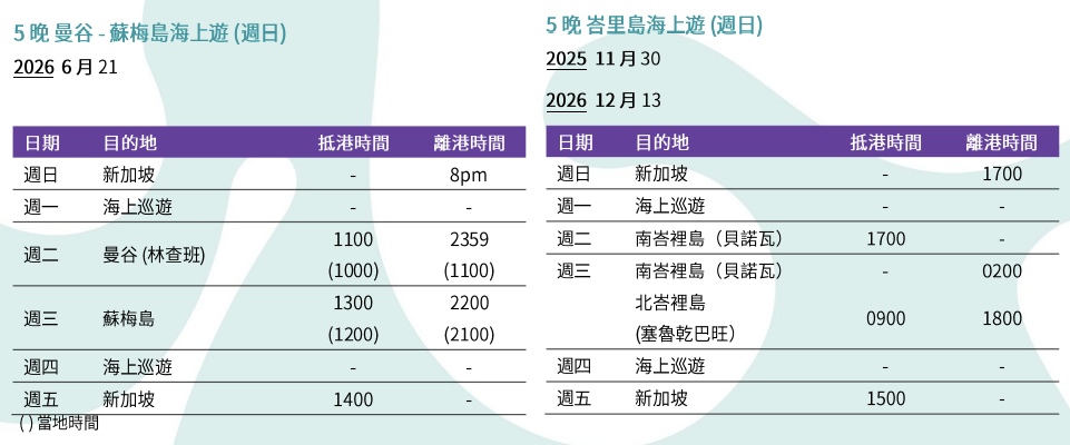 新加坡(濱海灣郵輪中心)及馬來西亞(巴生港 / 馬六甲)。香港旅客可先飛往新加坡,結合「Fly-Cruise」模式享受兩地旅遊。