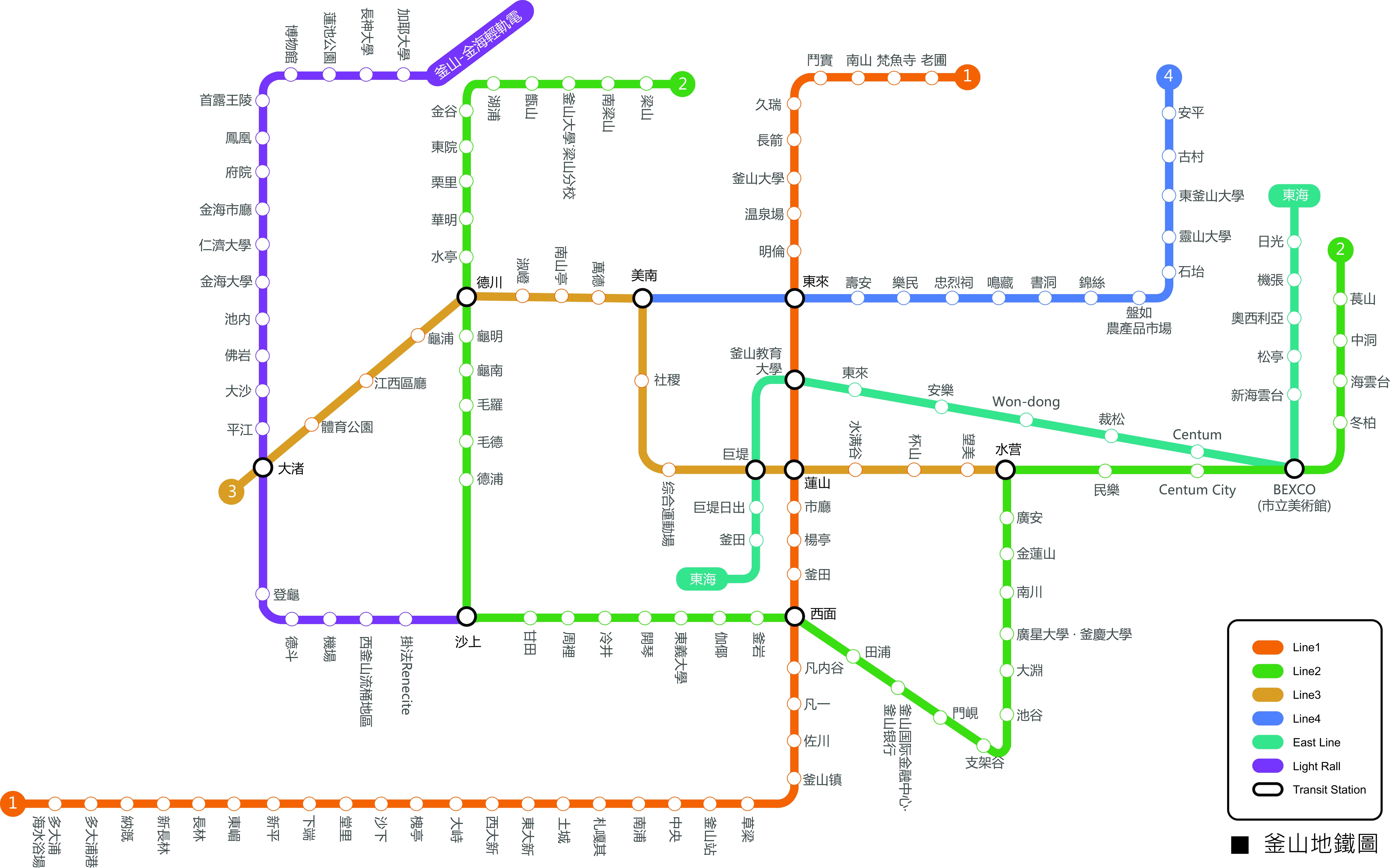 - 1 號線(藍色線):南北走向,連接了釜山站和海雲台站等重要地點,是釜山地鐵系統中的主要幹線。