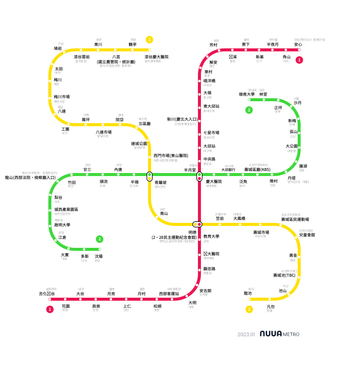 - 2 號線(綠色線):東西走向,貫穿大邱市中心,經過東區、西區等繁華地區。