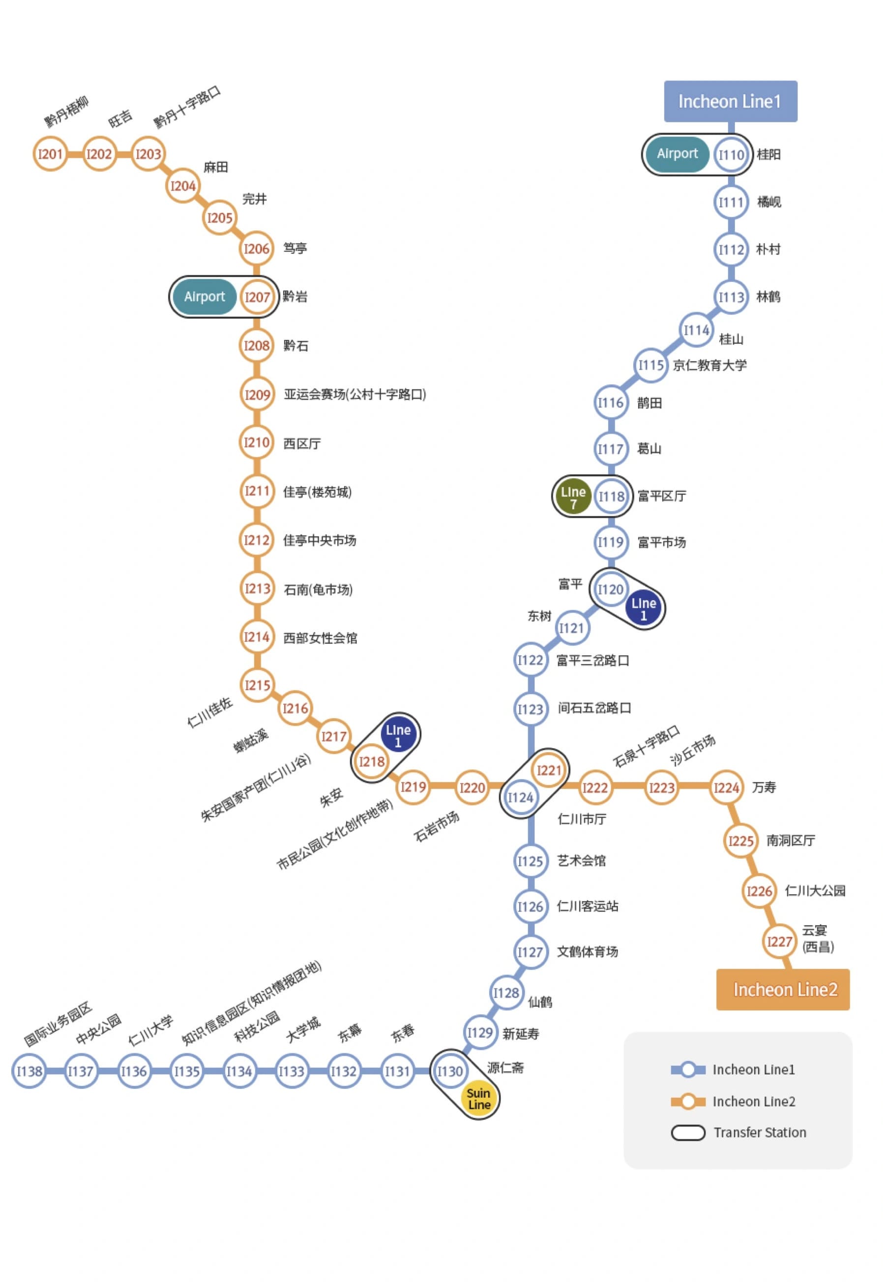 - 1 號線(藍色線):南北走向,連接了仁川國際機場和首爾市區,是乘客往返機場和首爾的重要交通幹線。