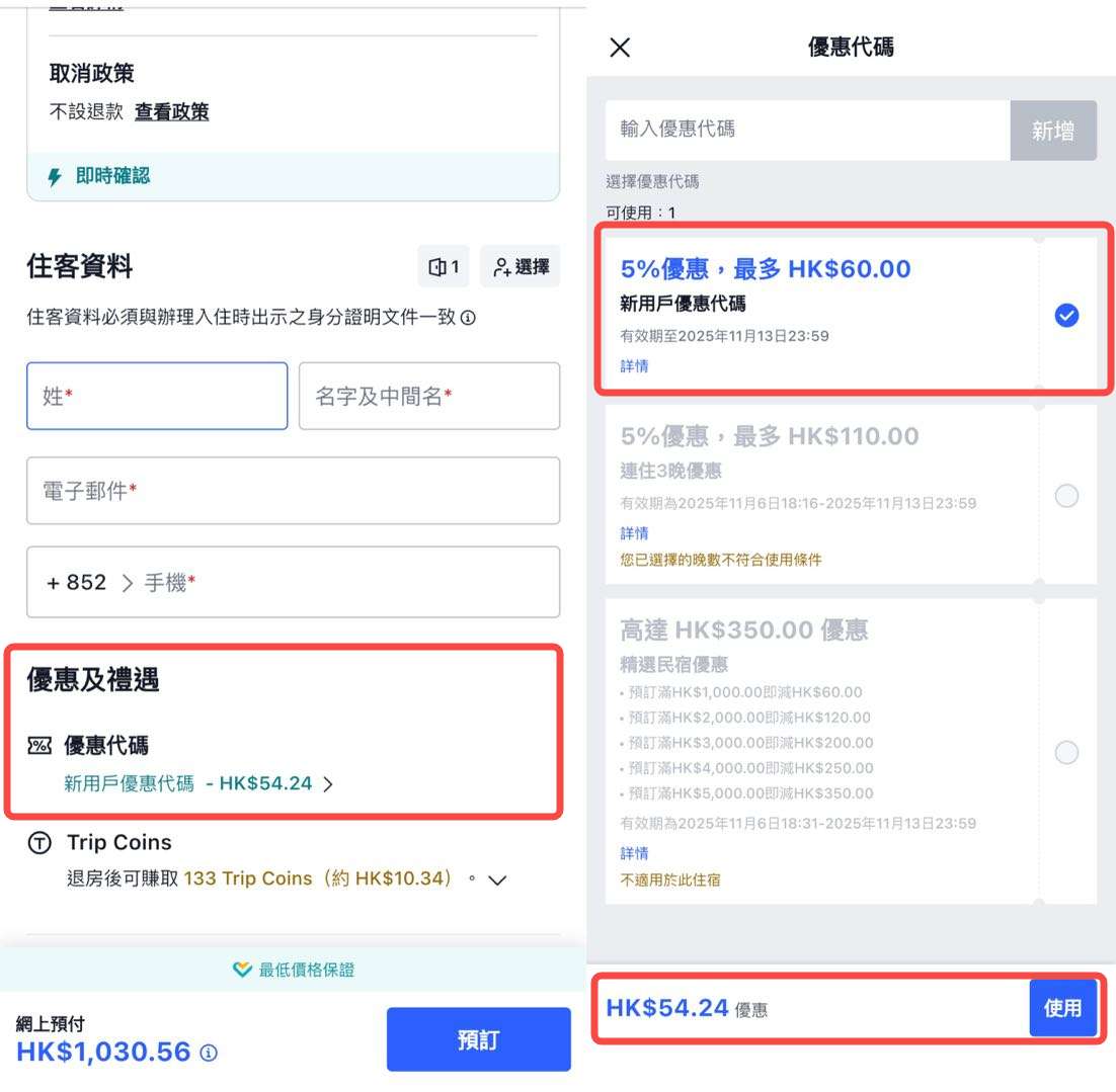 成功領取了新用戶優惠碼後,如何在預訂時實際應用並享受折扣呢?這裡以酒店 5% 優惠碼為例,為您示範詳細的結帳步驟:
