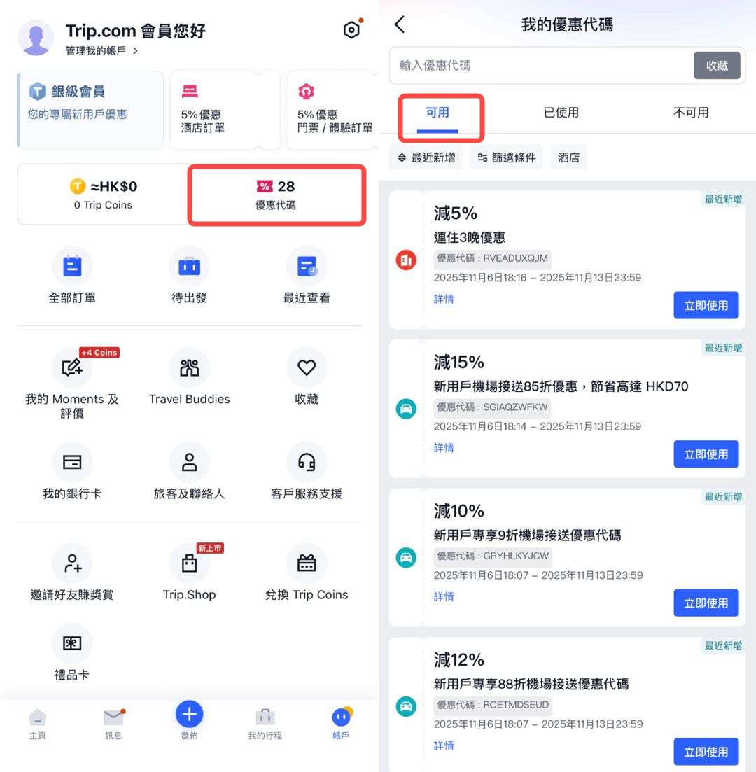 - 進入 Trip.com App 右下角「賬戶」的「優惠代碼」頁面,找到您想使用的酒店優惠券(例如:酒店 5% 折扣)。