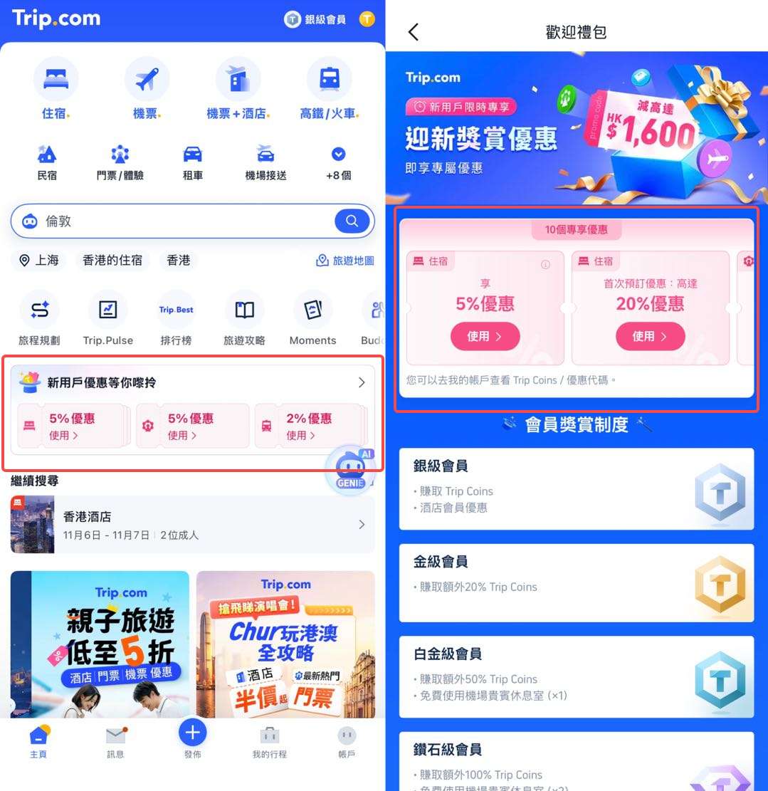 初次使用 Trip.com App 的您,千萬別錯過獨家準備的「新手大禮包」!這個禮包通常包含酒店、機票、機場接送等多種服務的優惠券,其中酒店折扣甚至最高可達 20%。