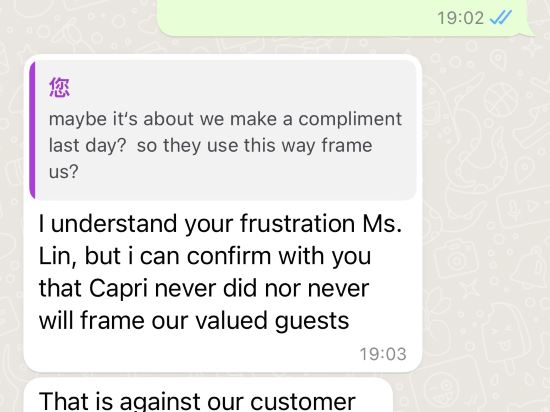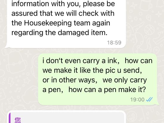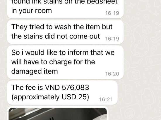 對這酒店的印象太差了。第一天到酒店的,錢包都是隨身帶的,所帶的現金都是完整的沒有缺少的,然後第二天就因為不想帶包,覺得太繁重,所以就把錢落在酒店裡了。但是當參展完下班後回到酒店的時候,就發現所帶的現金少了150萬越南盾,摺合人民幣約467塊錢。為什麼我這麼清楚我少了多少錢呢?因為我就是覺得越南的錢數額太大了,不好數,特意兑了四張金額大的四張50萬的越南盾,當天出去吃飯的時候,就發現少了三張,去找酒店經理理論,酒店經理第一天態度好的要死,我跟他説實在不行一人一半,不能左右損失都讓我出,他説他去找領導協商,結果最後一天我要check out 的時候,人家就衹來了一句i am so sorry,簡直不是一般浪費表情,期間投訴的時候還污衊我們弄臟它的被單,拜託,我們連筆都沒有,怎麼弄臟,頂多一衹圓珠筆,怎麼弄那些污漬,如下圖所以