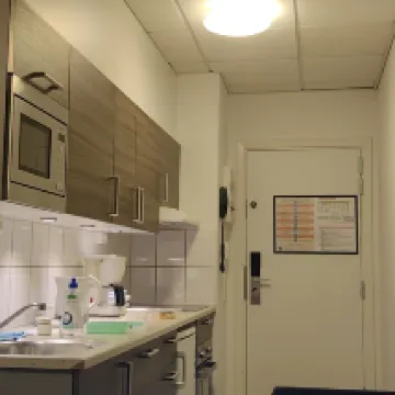 房間衞生出乎意料的乾淨到無死角,房間小的也很意外,廚房有2個電磁爐頭,一個煎鍋,二個大小湯鍋,西式廚具和盤子充足(沒有筷子和碗),洗碗精和刷子都配了,冰箱很新而且超級乾淨無異味。衞生間配有2小瓶洗髮沐浴二合一,每張床上放有三條疊的整整齊齊的浴巾(兩張床各三條),衣櫃裏有充足的衣架和燙衣板、電熨斗,吹風筒。陽台有個小方桌和兩把靠背椅。房間雖小,設施俱全,對了,電視機小面有個橫台和兩把高背椅,略微有點突兀,我們住的204,陽台正對一棟居民樓的花園,週五晚上幾對年輕人在室外開派對,先是在撘好的白色帳篷裏用餐,用餐後出來做分組遊戲,接下來放音樂🎵跳舞💃公寓樓上的鄰居一起圍觀,現場觀摩了一次當地青年人的自娛自樂活動,熱烈而不失高雅,感受到丹麥人平靜而有趣的生活!我們退房剛好是週末,前台工作時間是週一到週五,離開時把房間鑰匙放在固定收鑰匙的盒子裏就行啦。對了,公寓旁邊走路六七分鐘在奧胡斯建築學院旁邊有一家超市,食品豐富,價格適中,半成品很多,適合不開伙的學生族。