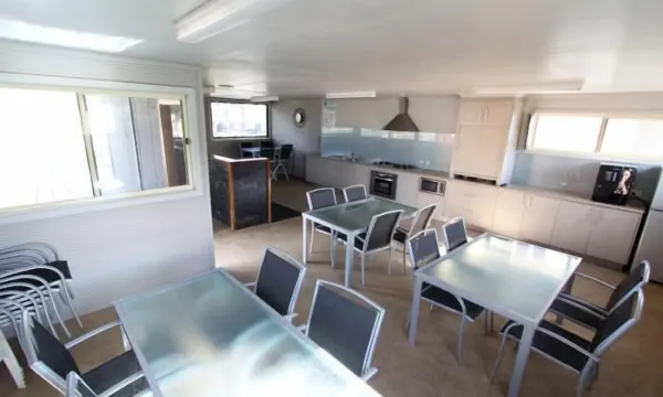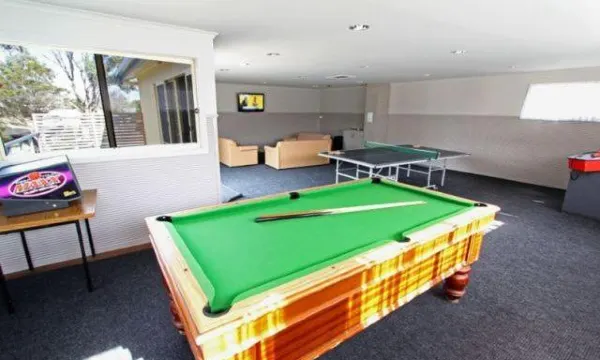A well laid out park with good sized sites and great amenities. The park is set back a block off the highway so there is no traffic noise. The camp kitchen was well equipped, one of only a few I have seen with a pizza oven. In warmer weather the pool would have been popular . The amenities block was clean and shower cubicles were a good size.