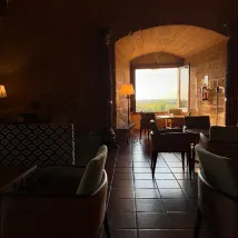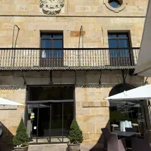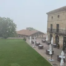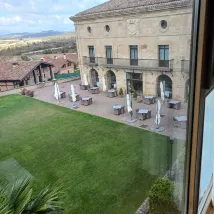 Un edificio singular en un entorno muy tranquilo. Algo alejado de la ciudad, lo que es algo incómodo. Habitaciones muy confortables y limpias, lencería de cama de muy buena calidad. El almuerzo en el restaurante fue una buena experiencia. El local es muy acogedor, con una preciosa estructura de madera tradicional que sustenta el techo. La calidad de los productos es buena y están bien tratados en la cocina. Los vinos locales con una buena relación calidad-precio, muy recomendables. El servicio amable y correcto, pero no me preguntó por el punto de la carne y cometí el error de no indicarlo, por lo que me trajeron el lomo de ternera bastante hecho, una lástima.