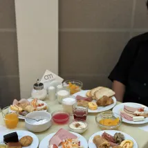 我們凌晨兩點左右到達,但一位高大的男工作人員熱情地接待了我們。考慮到我們很累,他還為我們倒了些水。飯店離最近的車站很近,早餐很美味,我們住得很舒服。