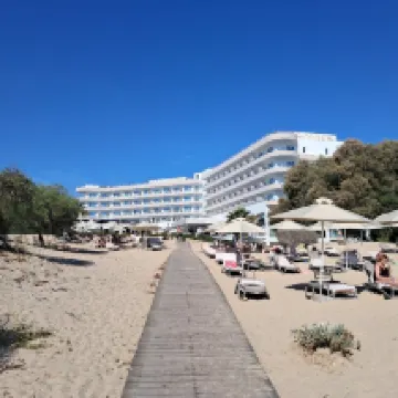 Hotel type club avec animation en soirée et club enfants. Acces plage direct et transats réservés pour les clients de l hotel, la plage est magnifique avec une eau très claire et quelques vagues. Piscine extérieure assez grande. En demi pension acces au restaurant sous forme de buffet a thème. Très grand choix Chambre pour 4 un peu petite, une seule pièce. Chambre avec vue sur mer et petit balcon. L hotel était plein fin octobre avec beaucoup de touristes russes et allemand. Le personnel est très sympathique. Environ à 15 minutes du port à pied idéal pour une petite marche en fin de journée. Commerces à proximité