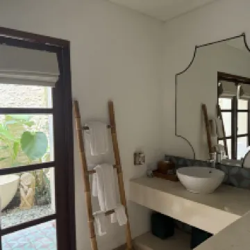 這家飯店簡直太棒了。工作人員是典型的巴厘島人,友好而樂於助人。租一輛踏板車並不複雜——只需提出要求,不久之後就可以使用了。我們很容易預訂一天的司機。搭乘摩托車 10 分鐘即可抵達購物區和美食街 不過,您也可以在飯店度過一整天,享受按摩服務和泳池餐廳。我們的房間是巴厘島風格的裝飾。淋浴和廁所在外面——這並沒有打擾我們。早餐很好吃。