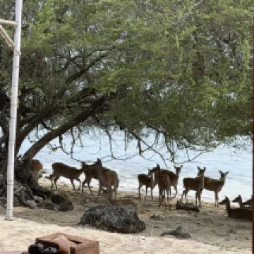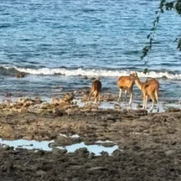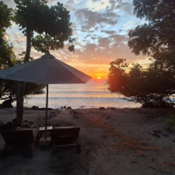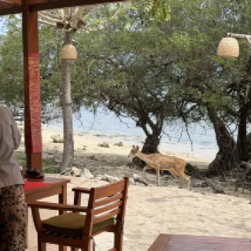 A little paradise... from the moment you arrive at Nusa Bay, you embrace the tranquillity. The short ferry ride across sets the scene for a wonderful place. All the staff are exceptionally friendly, special mention for the receptionist, Lia who was particularly friendly and helpful. We picked a lodge with a sea view, which I would recommend. (The others had a very limited view). The room and bed were surprisingly comfortable, with a large "fairly" modern bathroom. They supply bottles of water twice per day. The highlight for us was a group of about 20 black monkeys swinging over our terrace... quite a sight. There are also lots of Menjngan deer on the beach lounging around... grey monkeys and even a wild pig... Breakfast and dinner by the beach were perfect. The food was good quality and well presented. You can't walk outside the hotel grounds as it is in the National Park. In summary, a little oasis of peace and tranquillity, where you will wish you had booked more nights... we loved it.