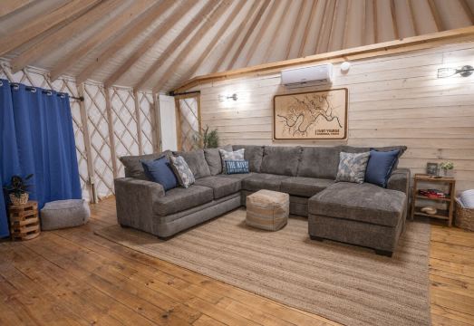 "Blue Jay" is cozy and features high ceilings showcasing the beautiful wood and natural light from the Yurt design. It has an open-concept living space featuring a large and super comfortable Queen Sleeper Sofa and TV (Streaming with own account only- No Cable). Our Yurts have been designed to offer the amenities of the modern world (Wifi, Bathroom, Comfortable Beds, large Kitchenette, A/C & Heat) while still providing a simplistic connection to nature.