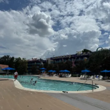 酒店位置特別棒,坐纜車和巴士去迪斯尼都很方便,酒店有游泳池,迪斯尼玩累了可以放鬆一下,我們晚上入住的,廣場還有烤棉花糖