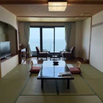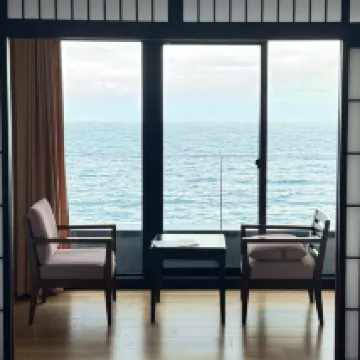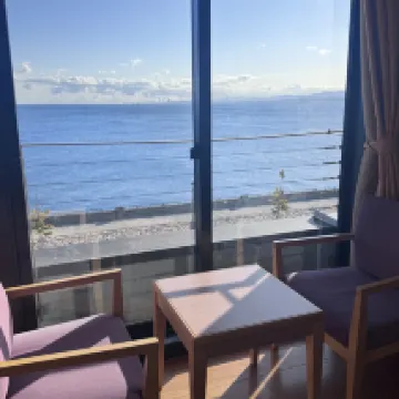 定的海景房,房間景色絕了,同時預訂了一泊二食,晚飯挺好吃的,生魚片非常新鮮哦,和牛好了非常好吃非常嫩,是自己烤,那個湯鍋一般般;早上的早餐非常日式,體驗感不錯的;室內温泉比較老舊,但泡一泡還是很舒服的;酒店地理位置是能走到海邊去的