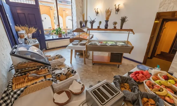 10 minute EUR3+ for taxi from the station, in the old town, arrived early 9am’ish, but allowed early check in, 2 nights, easy and polite (even offered breakfast too at check in). Room 2nd floor at front, big, good bathroom, bed and wifi; could get noisy in summer facing onto the street (& restaurant downstairs), but quiet after 10pm. Breakfast downstairs Mediterra Restaurant Bar, all good buffet choices inc muesli, eggs, bacon, mushrooms etc. plus cheeses and cold cuts. Also had dinner two nights at same, very good, chicken, mushroom sauce and grilled vegetables, following evening ‘Greek fish & chips’ anchovies and chips; service was fine, quite relaxed.