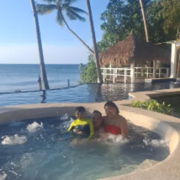 L'hôtel avait été privatisé pour un mariage avec une cérémonie sur la plage au soleil couchant et un buffet le soir pour 100 personnes. Nous sommes arrivés la veille pour nous reposer et profiter du cadre. On peut se promener le long de la plage mais la mer ne donne pas vraiment envie de se baigner. Notre chambre donnant sur la piscine était spacieuse ainsi que la salle de bains mais très bruyante quand il y a des gens dans la piscine. Petit-déjeuner compris avec une personne qui fait cuire les œufs à la demande en omelette, au plat ou brouillés, du riz et du corn beef pour les Philippins mais le personnel ne comprend pas toujours l'anglais et ils sont très flegmatiques. Les plats à la carte sont bien préparés et délicieux. Ne convient pas aux fauteuils roulants. On peut commander un massage en chambre à prix très correct.