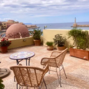 Pandora Suites is a lovely boutique hotel right in the center of Chania's Old Town with an unbeatable view of the harbor and the lighthouse. Lovingly restored and maintained, with lots of character and charm. The rooms overlooking the harbor might get noisy, particularly on weekends, but the view more than compensates for it. Breakfast is included and served on a rooftop terrace with 360° views (also of the White Mountains). Greek hospitality at its finest 👌. One drawback is the lack of parking close by so leave your rental at one of the parking spots recommended by the owner.