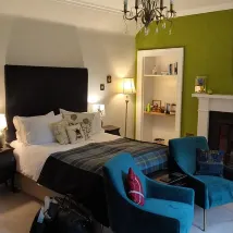 This was, by far, the most luxurious accommodation that we stayed in on our recent trip to Scotland. It was pricier than the other B&B's we visited, but offered much more in extras. We stayed on the ground floor in the Forsyth Room. It was convenient and quite large with a very comfortable king sized bed. There was a large wardrobe to hold our clothes, a desk, and coffee/tea station in the corner that included a chocolate treat each day. Home made scottish shortbreads were left out each evening for us, and a bowl of fruit that included grapes, oranges and apples was set out on the desk. The bathroom was modern with a large step in shower and heated towel bar. A hair dryer was included. Towels are large; no washcloths. The wi-fi had a strong signal. We had a small view of the sea from the room. Two comfy chairs stood near the bay window with the view of the back lawn and sea in the distance. Breakfast included a hot meal that we chose the night prior. I opted for the banana bread french toast one morning, and the toasted bagel with tomato, avocado and feta cheese the next. This was in addition to yogurt, granola and fresh fruit, or porridge with fruit and honey. We certainly did not leave hungry. A large living room was available for evening relaxation and it included an honesty bar. The B&B hostess also offers an in house dinner for a fee, if one chooses to just relax and stay in house for the evening meal. There is a large parking lot just outside the house. The walk into town is relatively easy, so one can leave the car and enjoy a lovely dinner without having to worry about driving or finding a parking place in town.