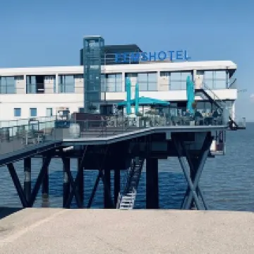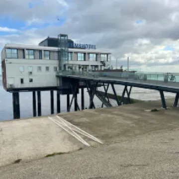 Aan het uiterste einde van Nederland, ligt een hotel op palen in de zee. Toen wij dit boekte verwachtte wij een idyllisch plekje in Nederland, maar daar aangekomen hadden we het idee midden in een industrie terrein te zitten. Het hotel zelf is een super leuk concept, maar de uitwerking ter plaatse viel tegen Kamer 1 was echt koud! Met hoofdletters. De kachel hebben wij direct op 6 gedraaid, maar deed niets. Dus toen wij terug kwamen vanuit onze avond in Groningen city was het laat en koud! Opzoek naar een nachtportier, maar die niet kunnen vinden. Gelukkig nog een meisje wat de bar bet had afgesloten (rond 23.30 uur) en zij ging heel lief opzoek naar een kachel, niet te vinden. Dan de centrale verwarming omhoogdraaien, maar dit had geen effect. Wij hebben onder 4 dekens geslapen, met sokken aan. Toen wij dit melden, kregen we als excuus dat mevrouw haar echtgenoot er wel even naar zou kijken. Punt... geen "oh wat vervelend" "wat rot om te horen" niks van dat Jammer, want dit had echt anders opgepakt kunnen worden. De hotelkamer zelf was simpel, erg verouderd en overal zitten stopcontacten met gootjes. Het hotel zelf zie je ook overal stopcontacten... de badkamer was opzich schoon, maar de put liep slecht door en overal was roest... Dat is echt onnodig. Een likje verf of even nieuwe platen in het systeemplafond en het word echt een stuk leuker! Wat ons fascineerde is het zien van eb en vloed van zo dichtbij! Dat was wat het leuk heeft gemaakt. Ik zou het hotel zeker niet 1. 2. 3 aanraden, maar het concept is wél echt heel leuk. Dus mijn tip! Knap het wat op, maak het aangenamer om er te verblijven en dan is het echt een veel leuker hotel!