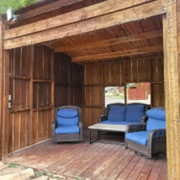 Pros: we sat on a bench by the river in the evening which was beautiful. They have made an effort to have unique and nice furniture and room set up with live edge varnished wood sitting table and counter.