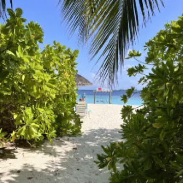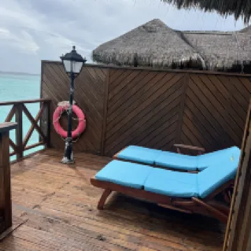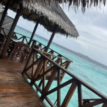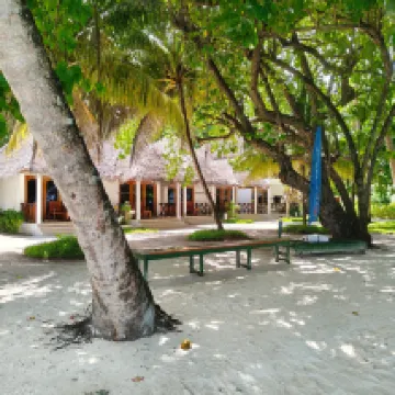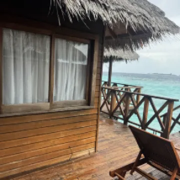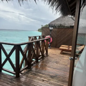 Мы были в первый раз на Мальдивах, к тому же не являемся избалованными туристами. Прибыли в отель около 8-30 утра, сразу нас заселили в номер и мы успели позавтракать. Номер оказался по расположению один из самых удачных на острове - 205, второй этаж (мы заказывали Deluxe Sky) правильно выбрали - люди мимо ходят очень близко к виллам. Номер для сорокалетнего отеля вполне достойный. Наше пребывание длилось 10 дней. Питание (у нас FB) очень вкусное, разнообразие не большое, но всегда на обед и ужин были блюда из курицы, рыбы, говядины, дважды ягненок, гарниры: паста двух видов, рис, картофель, много разных овощей, блюда каждый день разные, фрукты-яблоки, апельсины, ананас, папайя, дыня, арбуз, один раз манго, дважды маракуйя. Персонал очень профессиональный и доброжелательный, к тому же многочисленный, уборка в номере 2 раза в день, стол и официант закреплен за номером на весь период, обслуживание прекрасное никаких вопросов. Пляж - это то за чем мы ехали сюда - он невероятный со стороны нашей виллы: мелкий белый песочек, спокойная чистая вода, коралловый риф с множеством обитателей (маску брать обязательно, купить на месте тоже можно, но дорого). Советую взять с собой коралловые тапки, чтобы обследовать пляж и риф со всех сторон острова, дно с обломками кораллов, больно наступать, но рифы хотелось обследовать все, что тут есть. Тут стоит сказать, что мы любим разную живность и с удовольствием каждый день наблюдали за ящерицами, летучими лисицами, крабами, морскими обитателями, в т.ч. акулами (приплывали каждый вечер к пирсу). Погода: был не сезон, из 10 дней 5 было ясных, 4 дня короткие дожди и иногда пасмурно, 1 день дождь шёл целый день. Для меня это не было проблемой, переплачивать за отдых в высокий сезон не стала бы. Мы получили всё, на что рассчитывали и даже больше. Это было восхитительно! Спасибо отелю и всему персоналу за этот отдых, уже мечтаю снова вернуться туда и буду всем советовать.