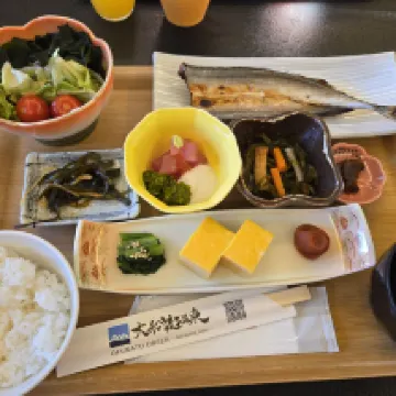 這是兼具日間浴場和飯店的大型設施。據說客棧供應美味的漁家菜,所以我以為這是一家漁家客棧,但我驚訝地發現它看起來像一家大酒店。這似乎是一個新設施。 客人可以在前台休息室享用咖啡(免費)。漂亮的日式房間有10張榻榻米大小,上面有蒲團。還有一張椅子。有兩把卡鑰匙,很有幫助。在房間的服務台註冊大船渡溫泉官方應用程式後,我收到了300克生魚片裙帶菜。它在家裡很有用,因為它數量充足並且可以立即使用。鶴愛在店裡買了兩袋肉荳蔻,因為它很便宜(她還收到了一張可以作為紀念品的優惠券,這給了她折扣)。當日往返浴場是一個大型公共浴場,有熱水和溫水,從露天浴池可以看到壯觀的海景。一體式物品放置在洗手間區域。雖然是一日遊溫泉,但週一下午四點左右,人不多,也很安靜,所以慢慢來。晚餐是我在東北旅館飯店的六晚裡吃過的最好的晚餐。這是一頓海鮮大餐,開胃菜是從三陸直送的裙帶菜米果、裙帶菜、海鞘生魚片。生魚片有鮑魚、鮪魚及其爬山虎、鰹魚和甜蝦。比起烤鮑魚,我更喜歡生魚片。脆脆的感覺是最好的。令我驚訝的是,大船渡溫泉的特產「劍魚兜飯」是經過三天慢火慢火熬煮而成的。旗魚的頭很大,大約有50公分(更多?),眼球大約有10公分(?)。你甚至可以吃骨頭,裡面充滿了膠原蛋白(他們切碎了你)。蒸扇貝是我吃過的最大的扇貝(大約5公分高)。蒸蛋奶凍是用自產的裙帶菜製成的,還有烤秋刀魚和脆炸鰤魚。遺憾的是,我沒有點岩手縣一丁點米飯和秋刀魚魚丸湯,因為我吃不到。兩個朋友都答應了要湯的要求,所以晚餐吃得很飽。酒類選擇了大船渡町的當地酒“Nigori Sake Yukikko”(300cc 1100日元)。它又乾又美味,我把它當作晚餐。聽說早餐是早上7點到9點供應,本來以為是自助餐,結果是日式餐點。自助餐有果汁、小岩井牛奶、咖啡等飲料,還有納豆海藻、水果、濃鬱的杏仁豆腐、大船渡當地的甜點「鍋燒」。鍋燒裡有紅糖。早餐包括很多當地產品。豐富的海藻來自業主的三陸地區。燉海帶絲、生薑味裙帶菜、三陸裙帶菜和金槍魚山掛、烤魚和蓬鬆的高湯卷*味道溫和。這頓早餐也很豐盛,很滿足。