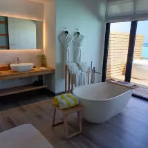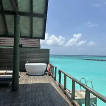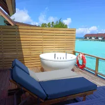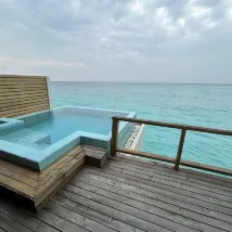 我在水上別墅按摩浴缸住了兩晚,包含全包套餐。其中包括免費飲料和食物以及當天提供的一些活動。我喜歡這裡的海。這裡的水很清澈,景色很美,還有有趣的活動,例如 Funtoy、水療中心和水上摩托車(105 美元/2),值得!