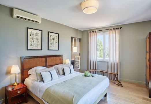 Après avoir découvert le restaurant du Bello Visto, j’ai souhaité sélectionner son petit hôtel (moins de dix chambres) afin d’y passer un week-end avec mon épouse, à l’occasion de nos noces de Faïence. Situé dans les hauteurs de Gassin – l’un des plus beaux villages de France – la localisation de cet hôtel offre une vue à couper le souffle sur le Golfe de Saint-Tropez. Son éloignement géographique de Saint-Tropez, sa proximité avec de beaux domaines viticoles, sa verdure environnante, sa position au cœur du village, en font un lieu tout indiqué pour passer un week-end loin de la fourmilière estivale touristique du Var. Mieux vaut s'y prendre en avance pour réserver et, surtout, obtenir la chambre souhaitée. Personnellement, j’ai réservé en janvier pour un séjour en août, mais il n’est peut-être pas non plus nécessaire de prendre autant d'avance. Le check-in se fait à compter de 15h00 (le check-out à 11h30, ce qui reste raisonnable). Lorsque vous arrivez, il ne faut pas hésiter à appeler afin que la voiturette vienne nous chercher et monte vos bagages, cela évite un coup de chaud. Nous avons été accueillis de manière très courtoise et souriante car l’équipe est vraiment au top. Des serviettes fraicheurs à la bonne odeur de lavande et un jus de fruits frais nous ont été offerts. Nos valises ont été déposées dans la chambre. 1- La chambre 8 Il s’agit d’une chambre supérieure traversante, située à l’étage, et offrant une vue d’un côté sur le village, de l’autre sur la nature verdoyante et les essences de Provence, ainsi que sur une partie de la mer (mais ne comptez pas sur une vue mer à 180 degrés non plus). Le lit se situe sur la droite, encadré de tables de nuit en métal noir modernes. Sur la gauche se trouve un bureau avec plein de petites choses : éventail, deux bouteilles d’eau (renouvelées chaque jour, bravo), une boite de sablés au citron. Puis c’est un canapé qui doit servir de chauffeuse, recouvert d’une jolie courtepointe blanc-crème qui prolonge la pièce avec, derrière lui, un joli lampadaire industriel. Derrière le lit, le mur est peint avec des couleurs chaudes et le paysage représente les essences du coin, notamment les grands pins parasols. Ce mur est un triptyque qui donne l’impression d’un immense paravent fixé au mur. La penderie est grande, dispose d’un coffre-fort et de nombreux cintres. La salle d’eau (couleur terracotta légèrement rosée, sauf erreur) est tout aussi pratique car disposant de nombreux rangements tant sous le lavabo, que derrière celui-ci, que sur le côté des toilettes. J’ai trouvé que la cabine de douche était grande mais cela n’a pas été de l’avis de mon épouse. Un sèche-cheveux pratique (pas ceux fixés au mur qui ressemble à des aspirateurs) et des produits Fragonard sont à disposition des clients, ainsi que du linge blanc et propre. La chambre est très bien isolée. Certes, si vous dormez les fenêtres ouvertes vous entendrez, à compter de huit heures, le carillon de l’église. Mais une fois fermées, vous êtes
