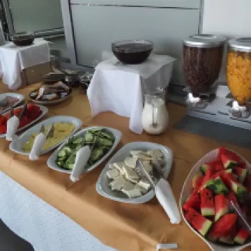 Really well located, modern hotel. This hotel is just beyond the end of the road up to the town meaning you don't have to take your luggage too far! Modern hotel, stayed as part of tour group so can't comment on value for money. We stayed in a twin room, 3rd floor at the end of a corridor. Room was largish and a pleasant temperature, some natural light. Comfortable beds. Good bathroom, bit narrow but as a bonus the shower was powerful and had adjustable temperature control! Two bottles of complimentary water. From here you can walk easily (uphill!) to all of the shops and sights of this lovely town. My favourite thing about the hotel was the rooftop restaurant; ate here the first night we got here as we were tired and it was late - pleasantly surprised by the quality and reasonable price of the food. There is an outside eating area and you can get drinks served too here. Fab view of the modern town below and up towards the historic part of town too. Lots of coffee shops, bars and restaurants nearby and a small Greek mini-mart up and first right. Breakfast ok, standard Albanian: bread, jam, eggs etc but served in the rooftop restaurant.