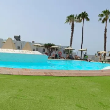 Mala experiencia, la señora rubia, robusta con gafas de la recepción muy desagradable, mal trato y actitud déspota desde el primer día, deberían darle clases de modales y trato al cliente a esa señora, no se puede tener esa mala actitud de cara al público, si no quieres trabajar, quédese en su casa, pero no arruine las vacaciones de personas q vienen a despejar y pasárselo lo mejor posible. Nos echaron de las instalaciones a las 11:00 de la mañana, y un amigo por coger un café a las 11:05 le cobraron 3€, muy ridículo, teníamos pensado alargar la estancia y por lo ocurrido nos fuimos a un hotel en playa del inglés. Jamás volvería a ese complejo