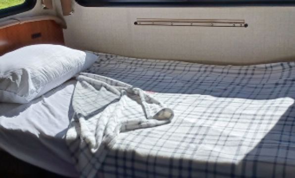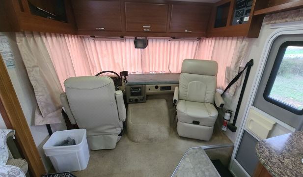 The RV is situated to enjoy the sunrise. There are some camping chairs for reclining outside the RV. There is a yard space outside the RV available to guests for their use.