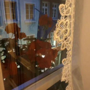 這個酒店位置對旅遊的人來説非常好,它就在景點裏,右邊可以看到老橋,左邊可以看到教堂,門口的這條街上都是吃的和紀念品,平常熙熙攘攘,人流如織。這對開車的來説有點不方便,平常車進不來,得把行李放路口再搬進來。如果走得早,可以把車開過來停門口上行李。車停到可以接受的稍遠的停車場。因為這個酒店本身也是餐廳,它是餐廳和住宿合一的,所以一樓一進來沒有大堂,全是餐桌,酒店接待的櫃枱很小,平時也不是一直有人,好像酒店房間也就十幾個,房間的窗户對着繁華的大街,不過還好,不算吵鬧,雖然床頭櫃上看到了耳塞,那顯然是給客人堵耳朵防噪音用的。房間還挺温馨,有兩個窗户,一種老城味道,床也很舒適,總之體驗都很好,感覺沒住夠。
