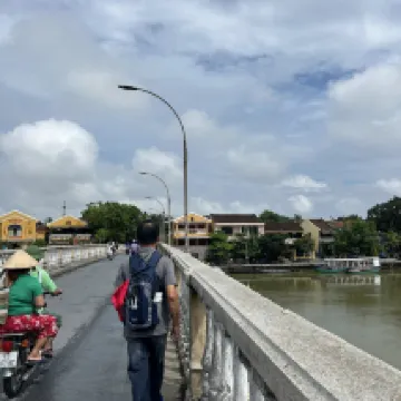 飯店有提供付費的飯店接送服務~從峴港去會安民宿單趟是13美金💲 雖然溝通常常有點比手畫腳😂但是阿姨人很好👍🏻 進去要脫鞋子然後換她們的室內拖鞋,房間有提供免費的3瓶水,冰箱內的都是要付費的,但價錢跟雜貨店賣的一樣。被子是很薄的有點像床單的感覺,房間內冷氣要開久一點才會涼,電風扇很吵是吊掛式的那種,我們是等冷氣涼了就關起來,有附牙膏牙刷跟小小包的洗髮乳跟沐浴乳。 從民宿走到會安老街上大約要10分鐘左右~我們就是每天過這個橋到對面比較熱鬧的市場跟景點玩
