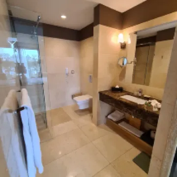 To słaby 4* hotel. Spędziliśmy tygodniowy pobyt z 1,5 rocznym dzieckiem. I chyba jeszcze nigdy się tak nie wynudziłam. Poza tym wiele oczekiwałam od hotelu z 5* tymczasem pokoje jak i obsługa pozostawiała wiele do życzenia. Pokój przestronny, ale bez możliwości otwarcia okna, można je jedynie uchylić. Klimatyzacja wyłączyła się po pierwszym dniu i dopiero w recepcji Pani poradziła żeby przytrzymać przycisk przez ponad minute( podziałało ale nie było to oczywiste). Przesuwane drzwi do łazienki i brak odpowiedniej wentylacji w łazience. Łóżko z jedna podwójna kołdrą dla 3 osób, to w ogóle absurd. Sprzątanie bardzo słabe, pościel nie zmieniana, o wymianę ręczników trzeba było prosić (nie schły same ze względu na brak wentylacji). Panie sprzątające chyba specjalnie przychodziły dokładnie wtedy, gdy byliśmy w pokoju na te 20 minut, żeby po prostu zrobić to po łebkach. W ofercie pokoju jest express do kawy i 2 kapsułki powinny być codziennie uzupełniane, niestety tak nie było. Sam teren raczej nic ciekawego tym bardziej, że nie jest on odgrodzony od deptaka wokół jeziora, gdzie wszyscy mogą wejść. Tiffilandia, super miejsce dla dzieciaków, natomiast rodzice mogą tam utknąć na cały dzień. Baseny spoko, choć momentami bywało ciasno. Obsługa dość młoda, mało doświadczona i nie na poziomie 5* hotelu. Jedzenie dość monotonne, codziennie to samo, pani robiła w kółko gumowate pancakes lub suche bajgle na ciepło. Kolacje tu polecamy dania kuchni tajskiej. Nigdy tak często nie musiałam rozmawiać z obsługa hotelową, żeby dostać to co powinno być od razu. Jedyne co mogę pochwalić to restauracja Brasserie, w której codziennie jedliśmy wspaniałe kolacje i Spa ze świetnym masażem, ale to usługi dodatkowo płatne.