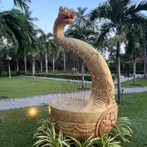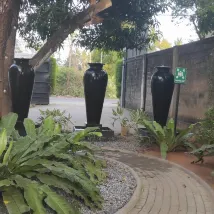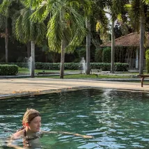 Un magnifique jardin bien pensé donnant sur une piscine décorée de jarres immenses et comprenant quelques tables du restaurant. Notre chambre est accessible par un sentier, wifi, frigo garni, clim et brasseur d’air, et des sachets pour le café et le thé. La douche est très chaude, avec un sèche cheveux, et le lit confortable • Seul bémol la musique et les chants qui émanent du temple voisin une grosse partie de la nuit . Petit déjeuner au buffet : viennoiseries , fruits frais et jus, plats nouilles et riz curry, des œufs…très bien