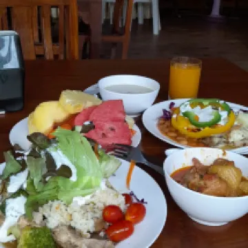 寬敞的房間有一個大陽台(二樓 19 號房間)。友好的員工。由於咖啡館有現場音樂(直到晚上 11 點左右),所以晚上有點吵。早餐相當簡陋——茶/咖啡、米飯、兩種烤麵包、奶油/蜂蜜、水煮蛋和煮火腿或香腸,甜點有鬆餅、西瓜或鳳梨。原則上,我們不會餓著肚子離開,但我們想要一些改變。