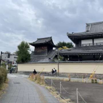 本願寺さんの宿坊です。宿坊といっても誰でも泊まれますし、ちょっと古めのホテルのような建物です。宿泊施設高騰の京都にあって、良心的なお値段で泊まれます。紅葉シーズンのピークの土曜日に泊まったのですが、唯一空いていた広すぎるほどの和洋室(3ベッド&6畳間)に一人泊1素泊まり10000円でした。お風呂付のお部屋でしたが、気持ちのよい大浴場(温泉ではないけど…)を使いました。朝の勤行にも参加できます。食事は付けませんでしたが、周囲に飲食店やコンビニがあり不自由はありませんでした。