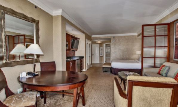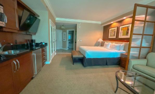The Signature is an exclusive, guard-gated resort, connected to the MGM Grand via an air-conditioned moving walkway. Our beautiful Junior Suite is 550 sq ft. The suite includes 1 king-sized bed, 1 queen-sized pull-out sofa bed, 1 bathroom with whirlpool jet tub, 2 plasma screens, mini kitchen, and more. Please note, the suite is not stocked with dishware and cookware. You may request that with the front desk upon arrival or call down to the front desk from the suite. The suite has a walk out balcony to enjoy the views of Las Vegas. Smoking is prohibited inside the suite and on the balcony. The hotel will charge a $500 smoke/marijuana vape damage fee to treat the suite for damage.