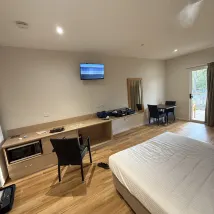 Best features: we had a ground floor unit. So we had a door out to the garden. The bathroom was clean and medium size. Beds perfect. Space-not cramped. Room additions fine for making your own breakfast microwave and fridge included also a table and chairs outside on concrete great for washing dishes. The hotel is located away from passing traffic. Air con and fan worked well..