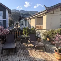 民宿在束河古鎮裏面,贈送的下午茶特別好吃,管家會幫忙運送行李,廁所共享,房間適合同性出遊,中間有個像小客廳區域可以看到小院子~