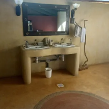 坐落在俯瞰馬賽馬拉平原的山脊上,您真的可以感受到荒野的氣息。主屋有一個很棒的露臺區,可以在那裡看日出,也可以在裡面用餐,欣賞同樣的景色。進入帳篷需要換乘專門的四輪驅動車,沿著一條非常陡峭的道路前行,但駕駛體驗非常棒。我們的帳篷被灌木叢包圍,所以看不到什麼風景,但哇,真是個帳篷。實際上,「帳篷」這個名稱用詞不當,因為雖然帳篷的側面和內部的屋頂是織物,但整個帳篷都有一個堅固的屋頂。帳篷的面積比我們的房子還大,鋪著漂亮的木地板。我們有三張床可供選擇,所以這個帳篷可以輕鬆容納一個家庭。在一堵凸起的堅固的土坯牆後面,有一個寬闊的區域,裡面有一個雙水槽,以及兩個分開的步入式淋浴間和衛生間。淋浴是瀑布式而不是噴頭,溫度很難控制,但總的來說非常實用。馬桶是標準的西式沖水,所以你在那裡不會有問題。所有工作人員都非常友好和樂於助人。食物種類豐富,種類多。其他設施包括一個游泳池,但我們沒有去。 WiFi 僅在主屋提供,而且可能有故障,但帳篷內沒有。唯一的問題是,由於營地可能會有野生動物來訪,所以你需要有人護送才能往返於主屋和帳篷之間。
