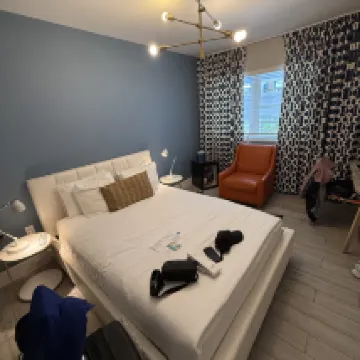 The decor is up to date and modern, but damage over the years has not been repaired (cracked tiles & blemishes on the walls). The king room for 2 comes with 2 soft plush bath towels, but only 1 wash towel and no hand towels. When an additional hand towel and bath towel were requested, "housekeeping" never came. Staff were always otherwise nice.