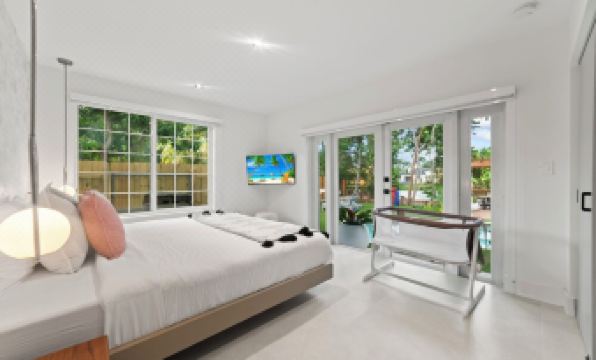 房間 1:主卧室,1 張特大號床,2 床头柜,智能電視,1 間內部浴室,可通往游泳池