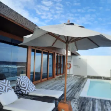 住了2晚145号水上泳池屋,地方好大可看到日出及日落,房內地板有約6呎X6呎玻璃窗可看魚,可惜風浪太大不能在露台外面海浮潛。員工服務質素高,酒店在我生日當天在餐廳豉樂表演完後突然所有員工一齊唱生日歌及送上有我名的生日疍糕,使我非常開心及感動。
