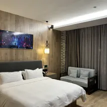 :酒店的房間佈置整潔舒適,設施一應俱全,非常適合度假和休閑。床鋪非常舒適。酒店位置優越,交通便利,周邊有很多美食和景點,非常適合旅遊度假。環境優美,給人一種放鬆的感覺